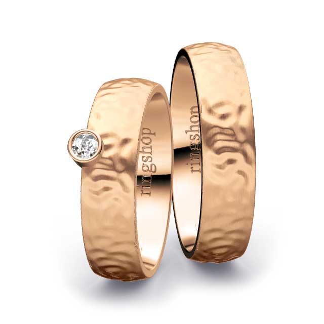 Rotgold gehört zu den außergewöhnlicheren Goldtönen und spricht vor allem Paare an, die nach etwas Besonderem suchen. Durch den hohen Kupferanteil erhält diese Goldlegierung einen intensiven, warmen Rotton, der sich deutlich von klassischem Gelb- oder Roségold abhebt. Die Farbe wirkt sinnlich, kraftvoll und modern – ein echtes Statement für Ihre Liebe.