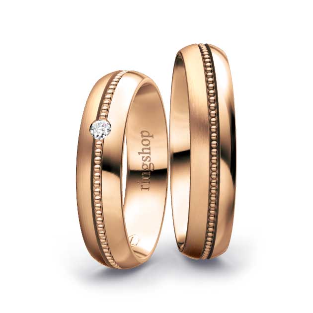 Rotgold: Es handelt sich um eine Legierung aus Feingold, Kupfer und Silber mit Goldanteilen zwischen 333/- und 750/-. Der etwas größere Kupferanteil sorgt für die namensgebende „rote“ Färbung und Härte des Materials. Der elegante und gleichermaßen zeitlose Farbton ist Kupfer ähnlich.