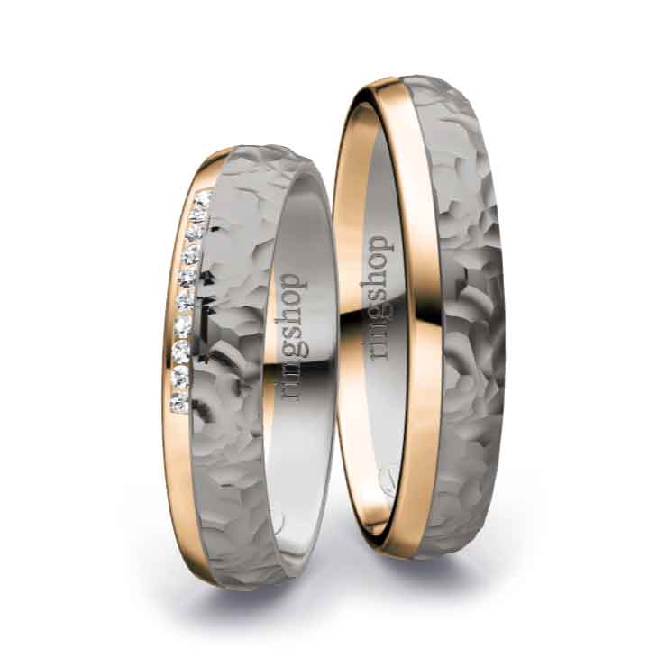 Palladium: Das mit Platin verwandte Metall Palladium erhält mit einem Feingehalt von 950/- eine besonders helle und strahlende Oberfläche. Mit einem Feingehalt von 500/- ist es deutlich dunkler wie etwa Graugold.