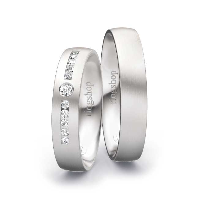 Palladium: Das mit Platin verwandte Metall Palladium erhält mit einem Feingehalt von 950/- eine besonders helle und strahlende Oberfläche. Mit einem Feingehalt von 500/- ist es deutlich dunkler wie etwa Graugold.