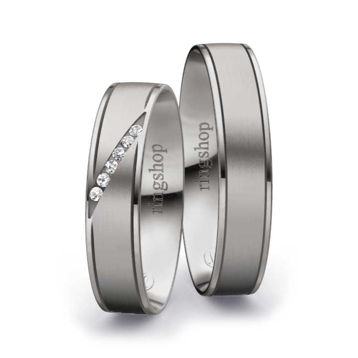 Palladium: Das mit Platin verwandte Metall Palladium erhält mit einem Feingehalt von 950/- eine besonders helle und strahlende Oberfläche. Mit einem Feingehalt von 500/- ist es deutlich dunkler wie etwa Graugold.