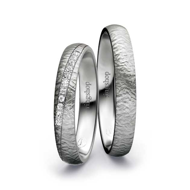 Palladium: Das mit Platin verwandte Metall Palladium erhält mit einem Feingehalt von 950/- eine besonders helle und strahlende Oberfläche. Mit einem Feingehalt von 500/- ist es deutlich dunkler wie etwa Graugold.