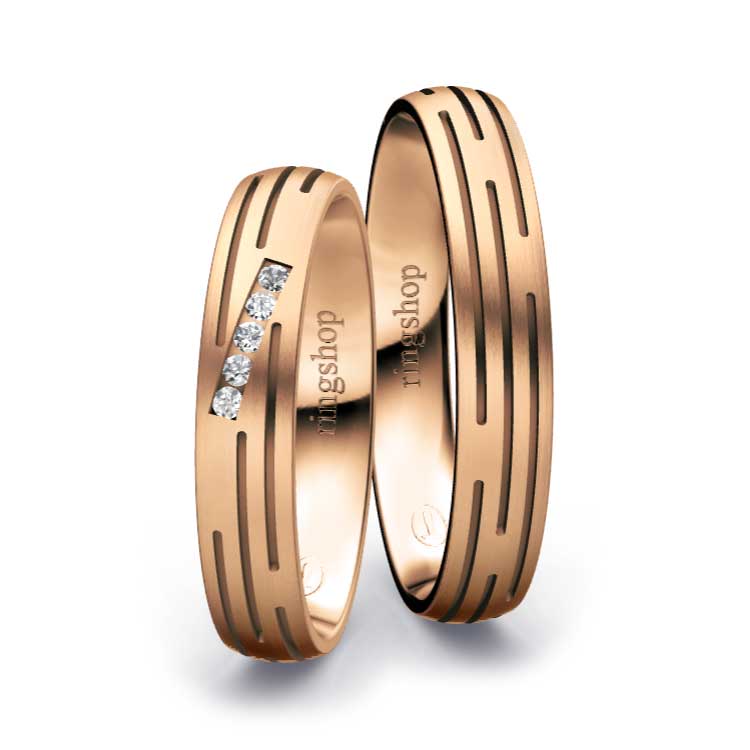 Rotgold: Es handelt sich um eine Legierung aus Feingold, Kupfer und Silber mit Goldanteilen zwischen 333/- und 750/-. Der etwas größere Kupferanteil sorgt für die namensgebende „rote“ Färbung und Härte des Materials. Der elegante und gleichermaßen zeitlose Farbton ist Kupfer ähnlich.