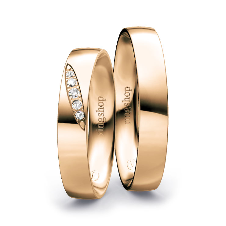 Rotgold: Es handelt sich um eine Legierung aus Feingold, Kupfer und Silber mit Goldanteilen zwischen 333/- und 750/-. Der etwas größere Kupferanteil sorgt für die namensgebende „rote“ Färbung und Härte des Materials. Der elegante und gleichermaßen zeitlose Farbton ist Kupfer ähnlich.