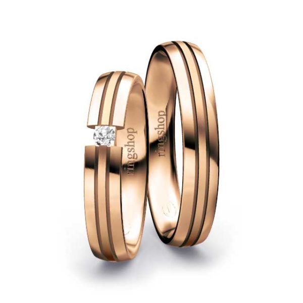 Rotgold: Es handelt sich um eine Legierung aus Feingold, Kupfer und Silber mit Goldanteilen zwischen 333/- und 750/-. Der etwas größere Kupferanteil sorgt für die namensgebende „rote“ Färbung und Härte des Materials. Der elegante und gleichermaßen zeitlose Farbton ist Kupfer ähnlich.
