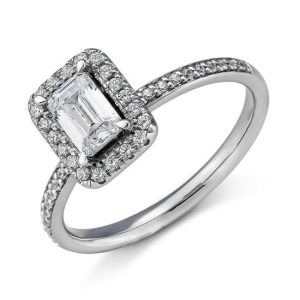 Hedwig Marina ist ein glamouröser Halo-Ring mit länglichem Mittelstein im Emerald-Schliff – ideal, wenn der Ring besonders auffallen soll.